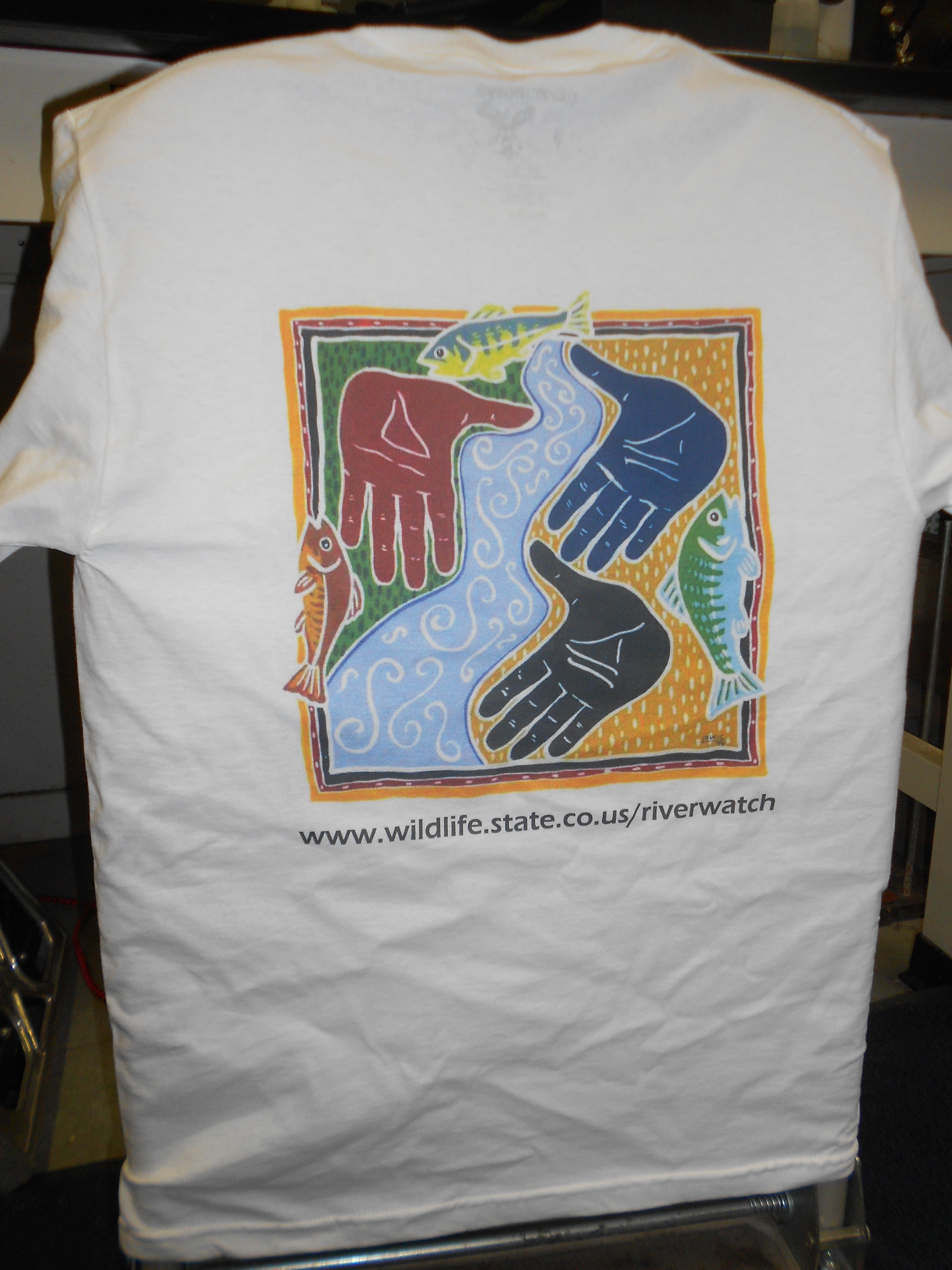 100% cotton. Lettering on front left breast, large color River Watch logo on back.